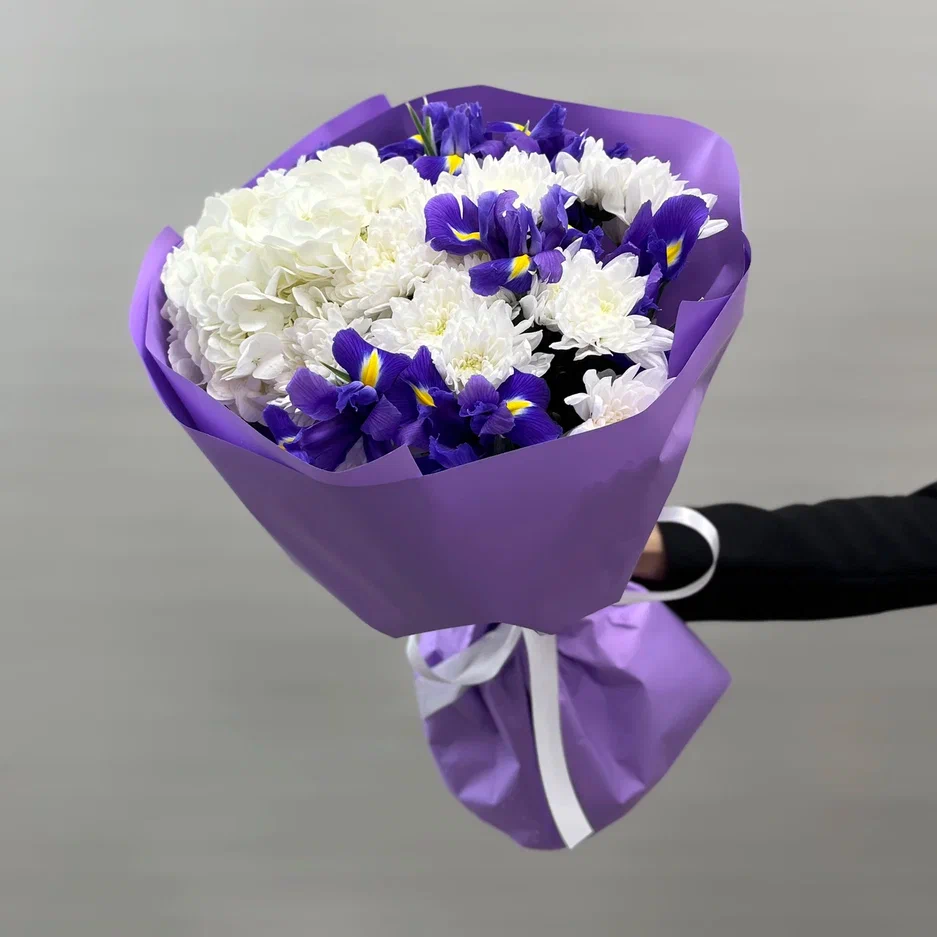 Букет с ирисами,гортензией и хризантемой "Уэлс"