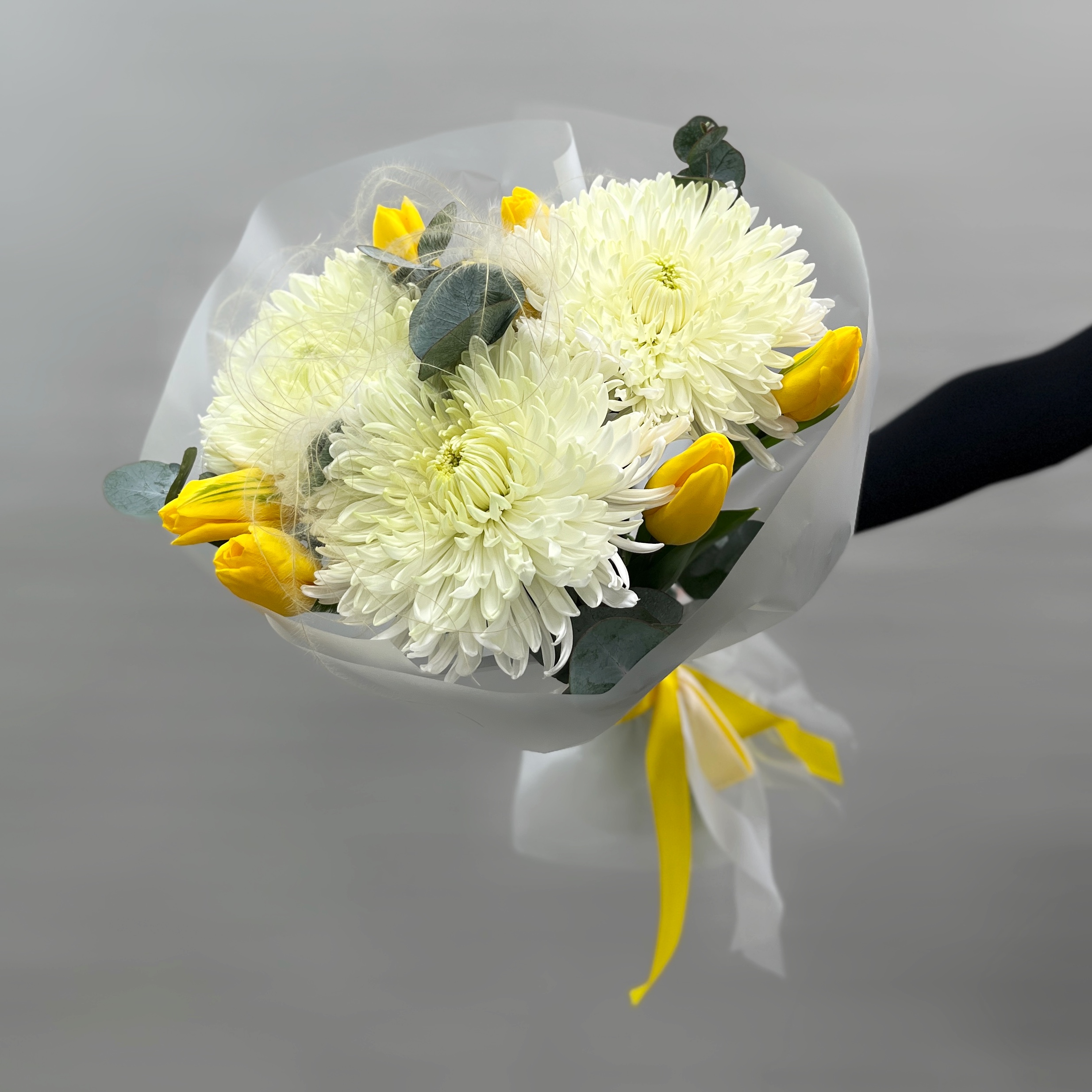Букет "Бухарест" из одноголовой хризантемы и тюльпанов
