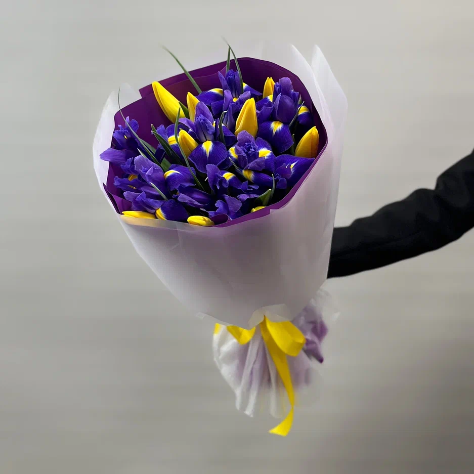 Букет из ирисов и желтых тюльпанов "Бендиго"