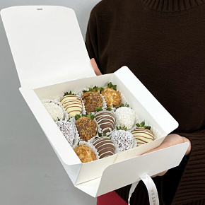 Съедобные композиции из клубники нетривиальны – будь то ягоды в корзине или элегантном картонном боксе, а потому вызывают восторг у получателя и становятся все более популярными. Такое чудо из клубники в шоколаде запомнится надолго!
