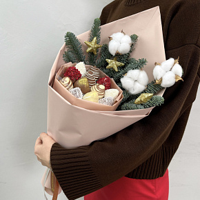 Букет из нобилиса и клубники в нежном молочном и белом бельгийском шоколаде, с посыпками из кокоса и вафли.